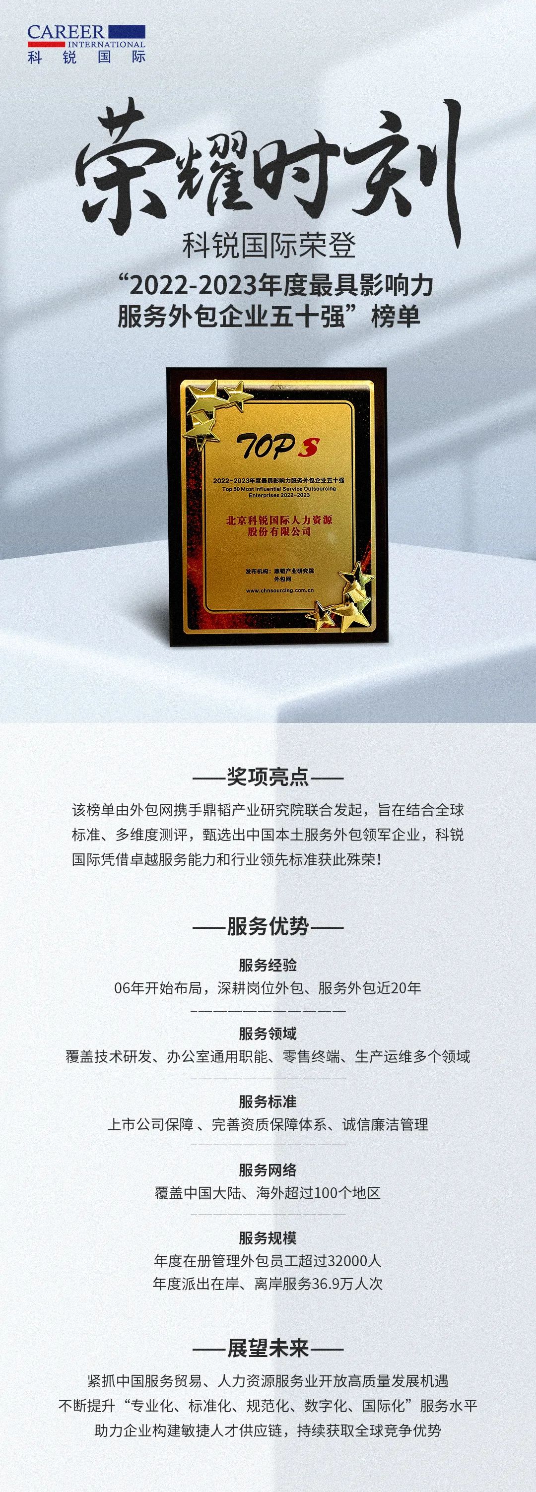 荣耀时刻 | 科锐国际荣登“2022-2023年度最具影响力服务外包企业五十强”榜单