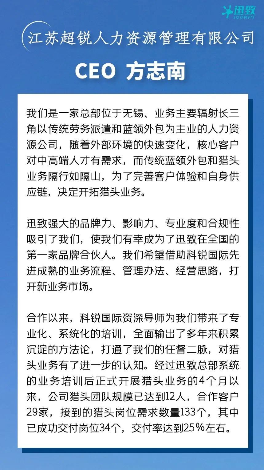 经过迅致总部的系统培训正式开展业务4个月以来,超信国际集团的猎头团队规模已达到12人,合作客户29家,接到的猎头岗位需求数量133个,其中已成功交付岗位34个。