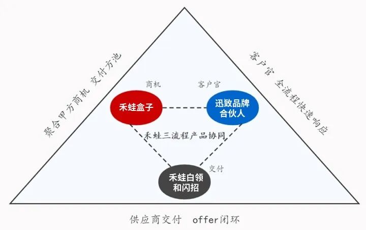 随着禾蛙迅致“客户官项目”启动,禾蛙生态体系进一步升级。形成了从商机到项目管理,再到交付的流程闭环。何洪锴称之为禾蛙“铁三角模型”:禾蛙盒子是商机聚合和分发平台。引入了中国人力资源服务机构中几乎所有的销售和渠道。很多猎头顾问表示,禾蛙盒子是“目前人力资源服务行业内唯一能找商机、找渠道的地方”;而商机领取之后,由禾蛙迅致加盟的客户官和科锐国际的顾问承接项目管理;并依托禾蛙白领版和禾蛙闪招两个平台最终完成交付。在“铁三角模型”中,迅致品牌合伙人体系作为承上启下的环节尤为关键。